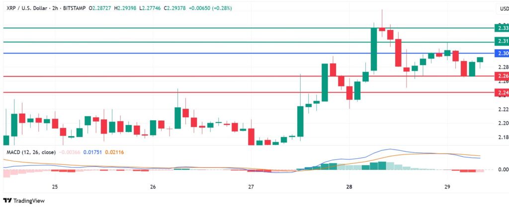 The momentum on XRP price signals that the sellers will likely stay in control if the coin fails to break above the $2.30 pivot mark. The asset will likely find the first support at $2.26. However, an extended control by the sellers could take the price lower and test $2.24.