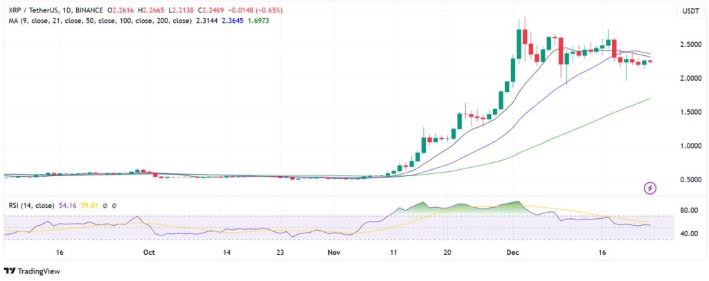 XRP price has been range-bound for the last five days, spending most of the time between $2.43-2.23. Notably, the coin has been resilient above the $2.20 mark and Bitcoin’s break below $95k has created a sour sentiment in the market. XRP has lost 9.8% of its value in the last week and has a weak upside traction.