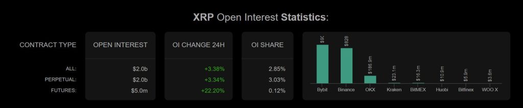 Meanwhile, XRP’s open interest data signals rising investor confidence in the coin’s performance. According to Coinanalyze data, the value of perpetual contracts rose by 3.34% in the last 24 hours to stand at $2 billion. In addition, futures contracts rose by a higher margin, gaining 22.2% in the same time frame. XRP price could experience substantial growth if the trend continues.