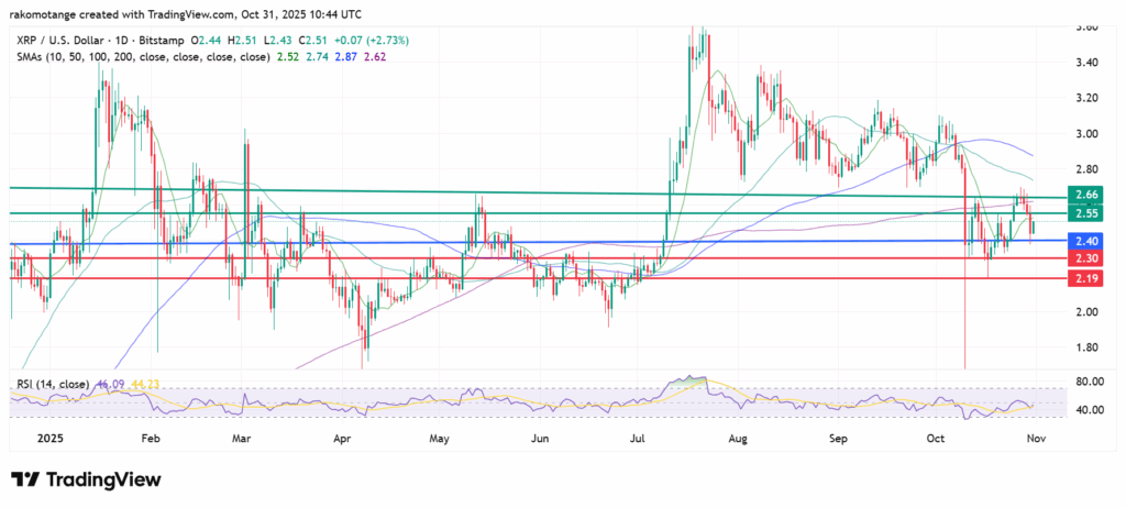 XRP/USD daily chart showing current action below key SMA levels. Source: TradingView