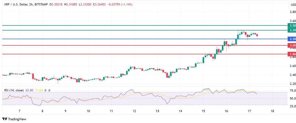 XRP price pivot is at $3.20 and the upside will continue if the coin stays above that level. It will likely meet the first resistance at $3.39, but a stronger momentum will break above that level and potentially rise to new record highs of $3.50.