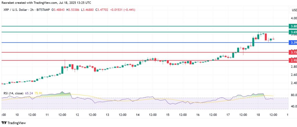 XRP price pivot mark is at $3.39 and the momentum will likely stay on the upside if action stays above that level. That will likely see the first barrier encountered at $3.65. An extended control by the buyers will break above that level and could push the action higher to test $3.80.