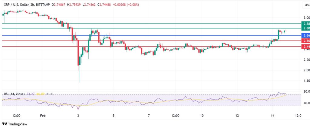 XRP price pivots at $2.66 and the upside will prevail if action stays above that level. The coin will likely encounter resistance at $2.80. Breaking above that level will strengthen the upward momentum and clear the path to test the second hurdle at $2.88.