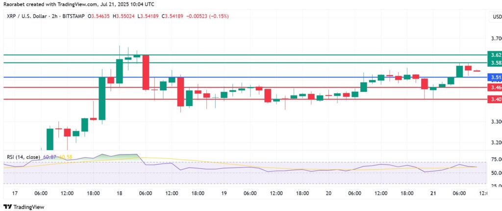 XRP price has its pivot mark at $3.45 and the momentum calls for further upside. The coin will likely meet the first resistance at $3.60. An extended control by the buyers will go above that level and potentially test $3.65.