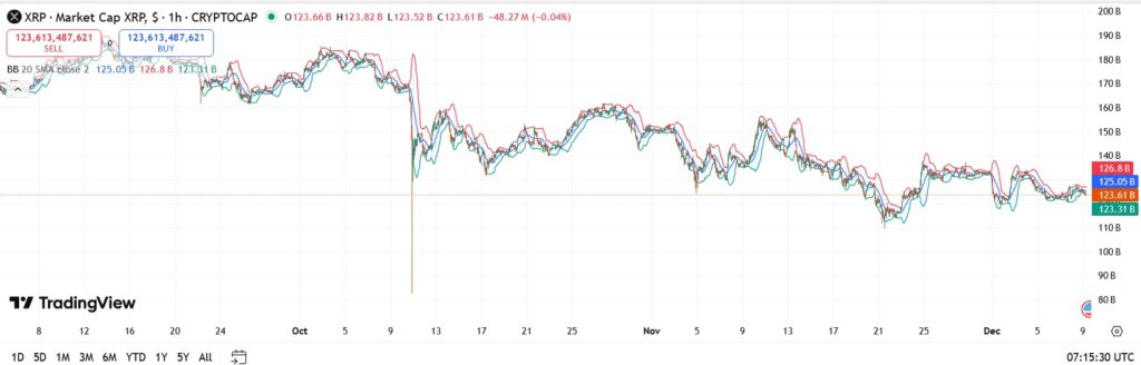 XRP is trading near 123.6 billion dollars in market cap terms with a clear downtrend since early October, followed by a flattening pattern throughout late November and early December.