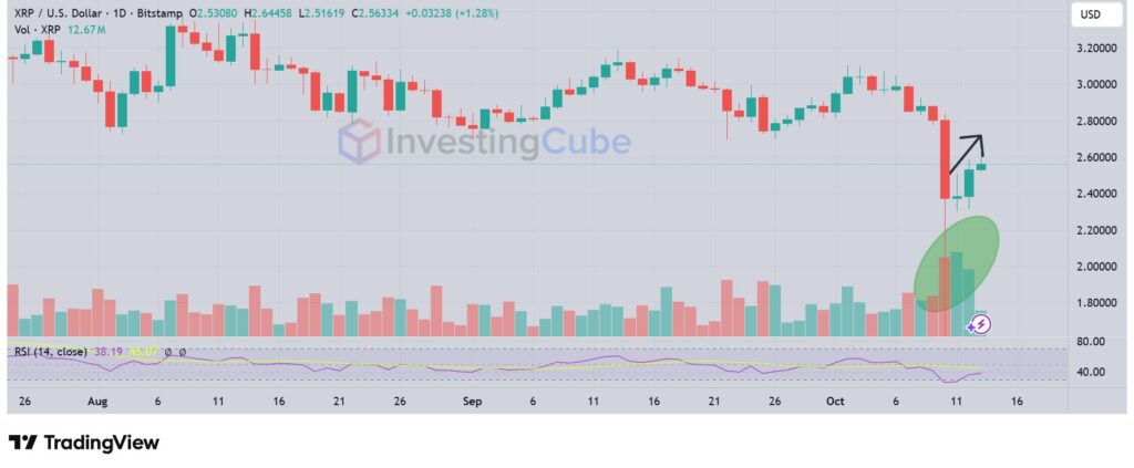 XRP price dropped sharply from about $2.77 to $1.58 between October 10 and 11, 2025. This represented a 40% decrease, the coin’s largest one-day drop ever. The collapse was caused by market instability after U.S. President Trump announced that starting November 1, all Chinese exports would be subject to 100% tariffs.