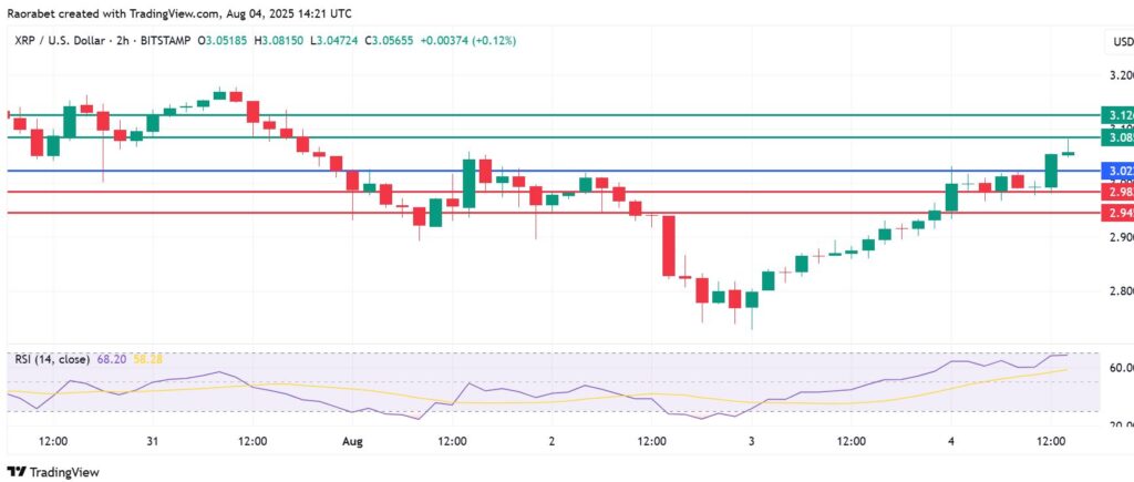 XRP price pivots at $3.02 and action above that level favours the buyers to be in control. That will likely see initial resistance encountered at $3.08. Breaking above that level will signal a stronger momentum that could push gains higher to test $3.12.