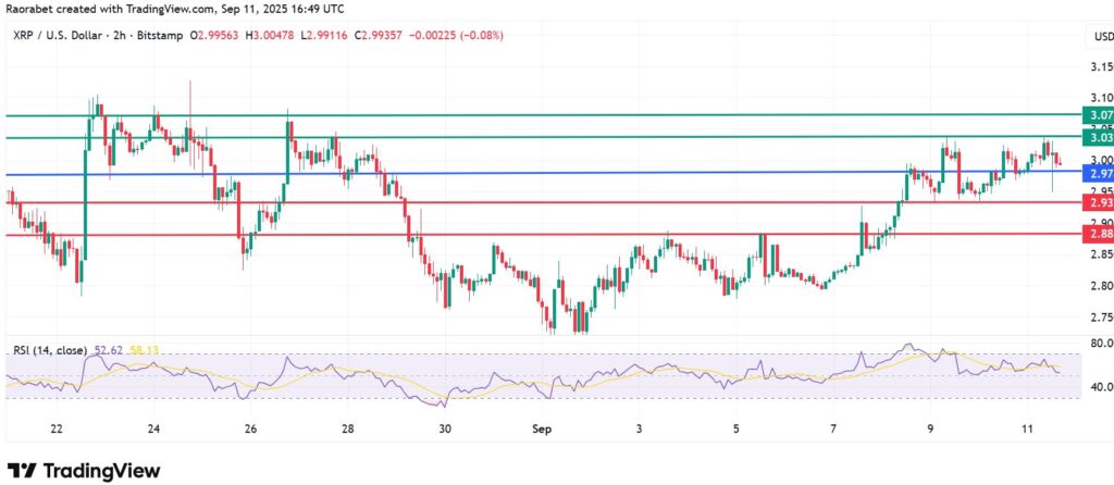 The momentum on XRP price signals control by the buyers and calls for further upside if action stays above the pivot mark at $2.97. With that, the coin is likely to climb further and encounter primary resistance at $3.03. A stronger upside momentum will breach that barrier and could potentially test $3.07.