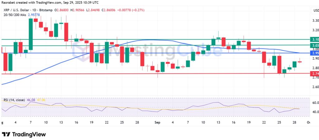 The XRP price outlook is still neutral, even though it has been caught in a falling triangle since July, with lower highs and a stable floor near $2.70. The price momentum has slowed down around the 50-day MA at $2.95, and strong upper shadows signal that sellers are protecting the area. After bouncing off of support at $2.74, the currency seems to be gathering strength. If the uptrend keeps up, the next target levels will likely be between $2.95 and $3.10.