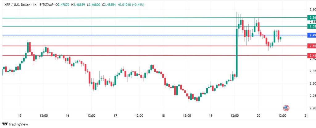 The XRP price pivot mark is at $2.49 and the sellers will have their way if resistance persists at that level. The coin will likely find its first support at $2.45. However, an extended control by the sellers will break below that level and test $2.41.