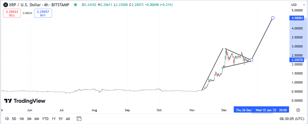 XRP price extended its gains on Thursday, gaining 3% to trade at $2.39 at the time of writing. The coin’s resilience above the $2 mark has paid off, and it has broken out decisively from a bullish pennant pattern discussed here earlier. That move raises the prospect of rising to a new record high price of $4.580.