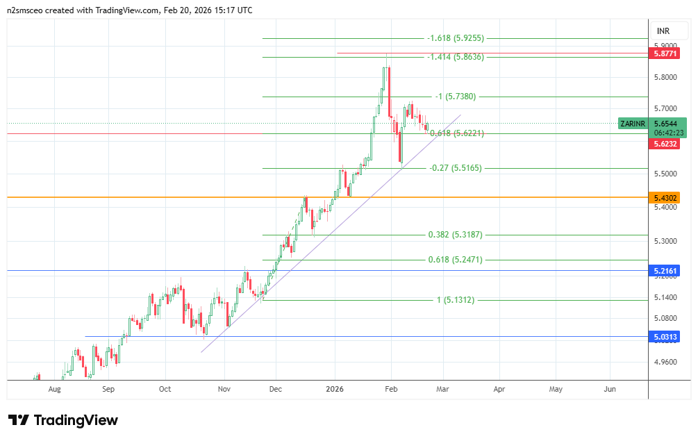 The ZAR/INR remains in the long-term uptrend, and the latest bounce off the trendline and the 5.6221 support (61.8% Fibonacci extension of the 24 November – 5 December 2025 upswing) keeps the higher lows intact.