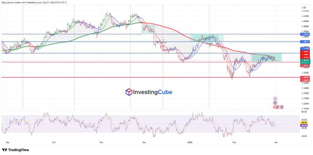 On the downside, immediate support is located around 1.3672, followed closely by minor intraday support at 1.3653. The major highlighted support stands at 1.3503, which represents a previous swing low and a key downside target.