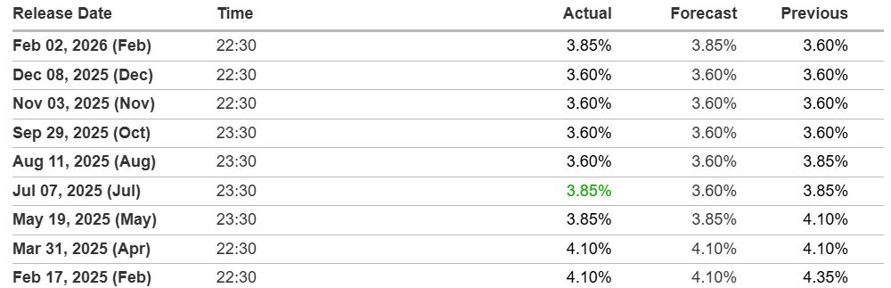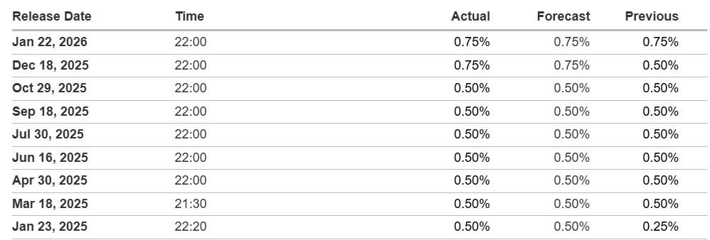 Bank of Japan (BoJ) interest rate decisions in the last year. Source: Investing.com
