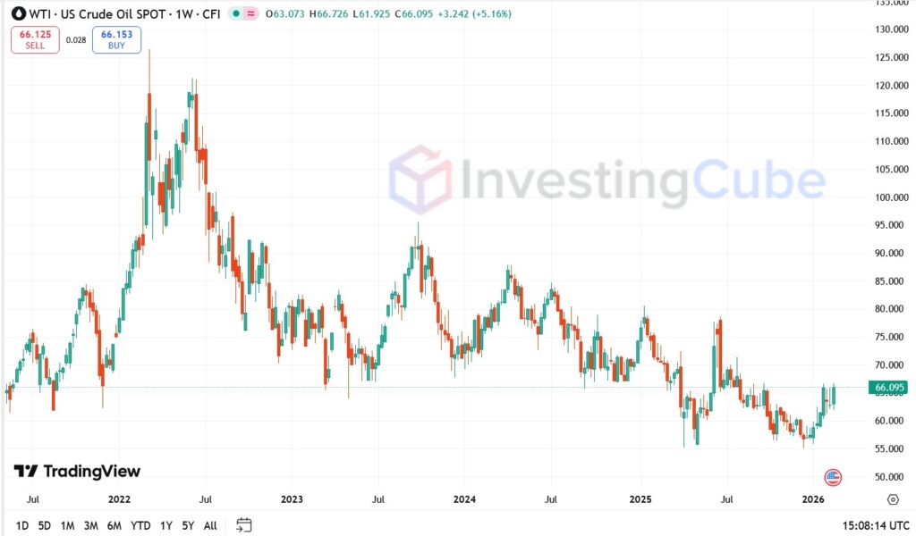 The weekly Brent chart confirms a “V-shaped” recovery from the $60.00 floor, with the current candle representing the strongest buying conviction seen in 2026. Similarly, WTI’s surge past the $62.00 support confirms that the “geopolitical risk premium” is now being institutionalized by long-term traders.