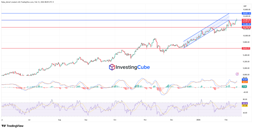 The MACD shows a bullish momentum while the RSI sits around 68.5, close to overbought territory. This signals that the index may face short-term consolidation before continuing higher. Overall, the chart suggests a strong uptrend, but traders should monitor the key resistance at 10,691 and support at 10,258 for potential breakout or pullback opportunities.