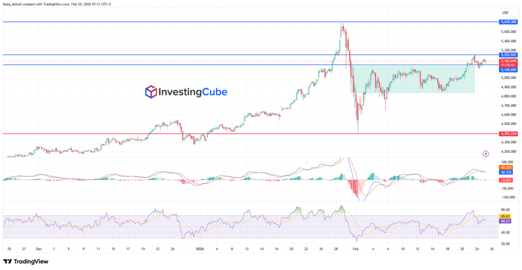 - Gold remains supported above key technical levels, with resistance near $5,252 and a potential move toward $5,610 if bullish momentum strengthens.