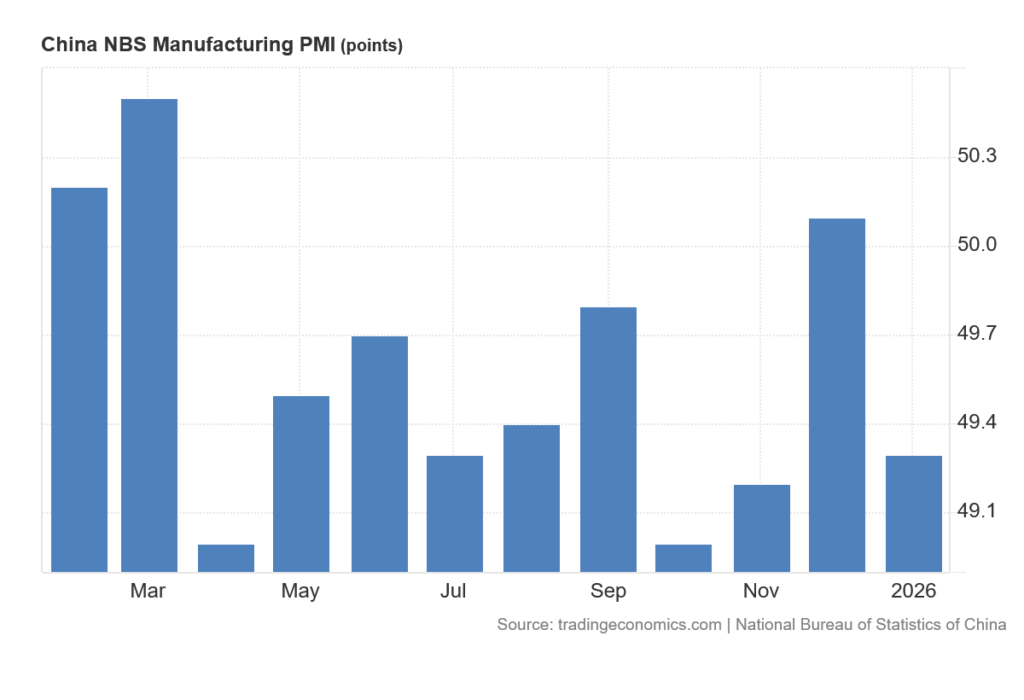 Beneath the central bank drama lies a deteriorating foundational support for the AUD: China’s economic pulse. The latest Purchasing Managers’ Index (PMI) data as reported by China NBS Manufacturing reveals a concerning split. While the services sector remains resilient, the official NBS Manufacturing PMI contracted to 49.3 in January. For a “commodity currency” like the Aussie, this is a red alert.