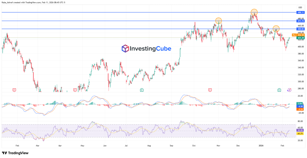 On the downside, price is currently hovering around the $423–$425 region. A sustained move below this level could expose the stock to deeper levels toward the psychological $400 zone. The MACD shows signs of recovery after a bearish phase. The RSI, currently around the low 50s, reflects neutral momentum.