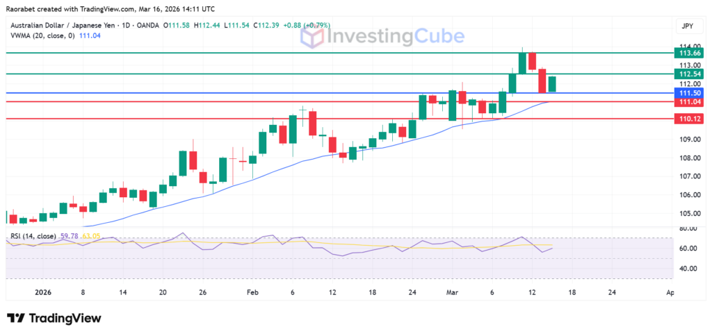 AUD/JPY has its pivot at 111.500 and the RSI indicates control by buyers on the daily chart. It will likely meet the first resistance at 112.54, beyond which a stronger momentum could send the pair to test 113.66. If it consolidates above this zone, 114.00 becomes the next major upside target. Immediate support sits at the Volume Weighted Moving Average (VWMA) at 111.04, with 110.12 as the next significant level below that.