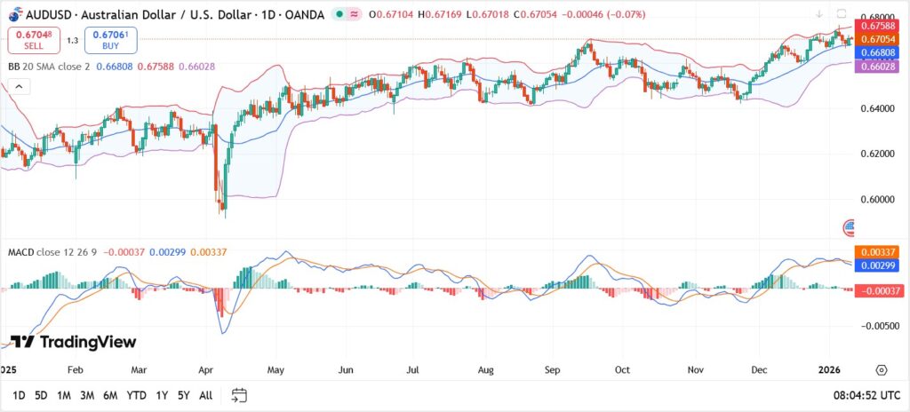 - Immediate resistance: 0.6750–0.6760 (upper Bollinger Band)