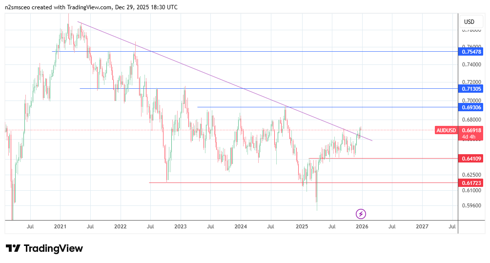 However, if the bulls fail to defend 0.6685 and the 18 December 2025 low at 0.6596, a push towards 0.6410 would be on the cards. A further descent towards 0.6172 invalidates the medium-term bullish outlook.