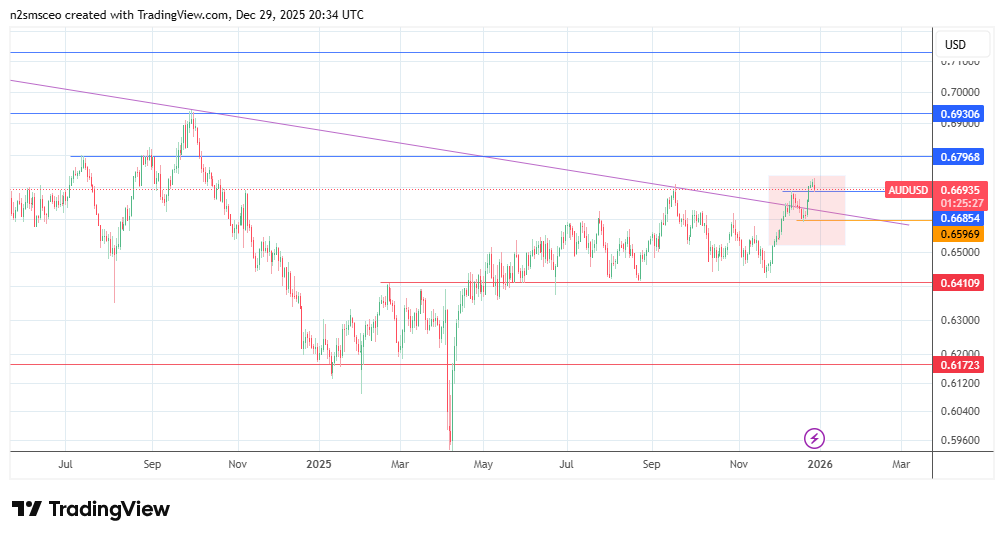 The AUDUSD may have lost some steam in Monday’s trading session, but the current technical and fundamental pictures are tilting towards dip-buying behaviour. This is visible on the charts, where the daily candle has found support at the recently broken high of 10 December 2025 at 0.6685, which is now acting as significant support.