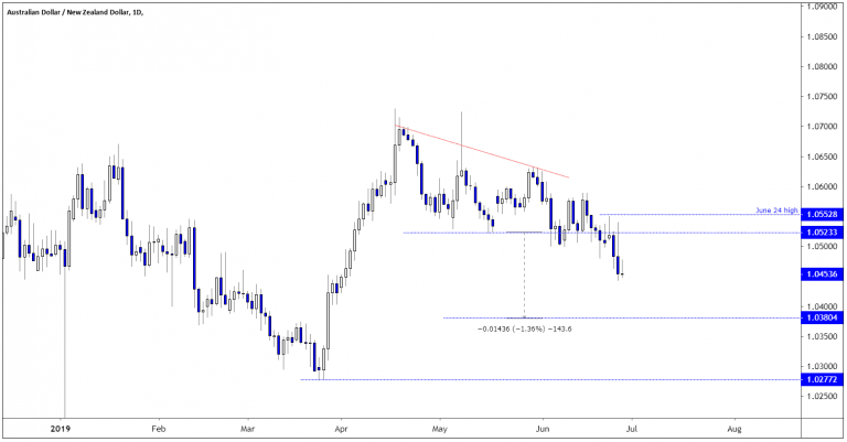 However, as the markets see it, the outlook for Australia is worse, and the AUDNZD has, therefore, drifted lower. From a technical perspective, the price formed a descending triangle pattern between late April and early June. The price tried to break lower from June 5 until June 25, but it is first in the last few days that the price finally managed to get out from the bearish triangle.