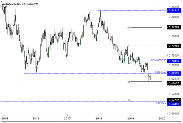 The main idea of central banks reducing interest rates is that it will support the economy by making loans cheaper, and stimulating spending. However, it takes time for lower interest rates to work themselves through the economic system. And as it stands now, economists project that the world economy could bounce back by the end of 2020. However, with trade wars ongoing it could negate the benefit of lower interest rates. What the Australian Dollar needs to stabilize is a trade deal between the US and China, or the US economy contracting sharply, and faster than Australia, until then the Australian dollar (AUDUSD) is at risk of trading lower versus the Dollar.