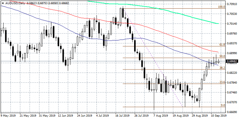 - AUDUSD trades above the 50-day moving average (0.6854) for the third day, but the price has stalled at 50% Fibonacci retracement of the drop from July highs