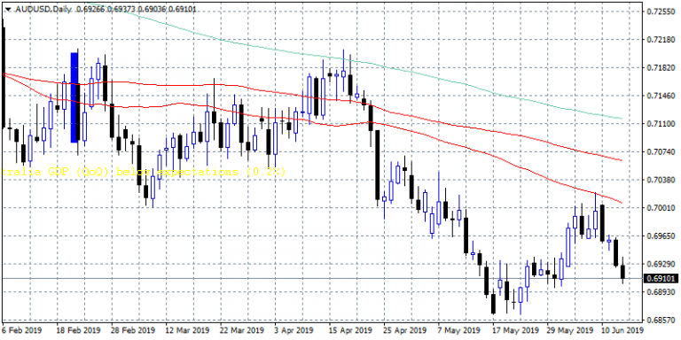 The Aussie dollar trades lower for one more day during the Asian trading at 0.6911, after the Australian jobless rate inched higher in May and bolstered July RBA rate cut hopes. President Donald Trump threatened to impose another round of tariffs on Chinese goods if he does not reach a deal with his Chinese counterpart at the G-20 summit later this month. The much anticipated Australia’s unemployment rate remained steady at 5.2% in May, contradicting the market expectation of a drop to 5.1%. The Aussie economy added 42,300 jobs in May, beating both the analyst’s expectation of 17.5K and the previous month’s print of 28.4K by a big margin. Economist’s boosted bets of an RBA rate cut in July, and the yield on the Australian bond yield fell to a record low of 0.992% early Thursday after the higher than expected jobless rate.