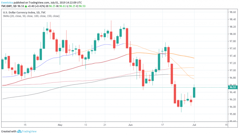 DXY managed to rebound from the previous week low at 95.85 and currently makes an attempt higher after piercing the 50 and 100 hourly moving averages getting a boost from better ISM figure. The positive momentum gains strength but I am looking for a sustained move above 96.79, the 20 day moving average to enter long positions and signal the return of buyers in the index. On the downside immediate support stands at 96 psychological mark while more bids will emerge at 95.85 previous week low.Don’t miss a beat! Follow us on Twitter.