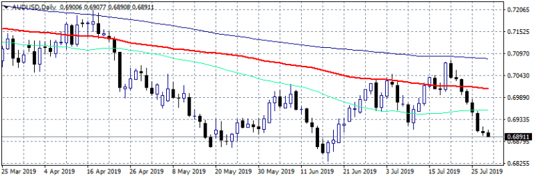 AUDUSD trades 0.11 percent lower at 0.6892 making fresh monthly lows after Australia Building Permits (year over year) came in at -25.6%, below expectations of -24.3% in June, while the Building Permits (month over month) came in at -1.2%, below expectations of -1% in June. The previous week Governor Lowe of Reserve Bank of Australia in a speech said that it’s reasonable’ to expect lower rates for longer time and RBA is prepared to ease policy further if needed. FOMC policy decision tomorrow, at which it is expected to cut interest rates by 25 basis points will drive the pair for the rest of the week.