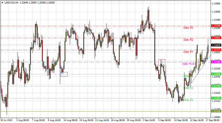 The Canadian Dollar is under pressure as the price of crude oil has fallen to intraday lows of $59.32. The USDCAD is currently trading at 1.3285, having touched off 1.3300 a few minutes ago after Saudi Arabia’s King Salman affirmed the ability of his country to deal with any consequences of attacks on its “vital installations”.