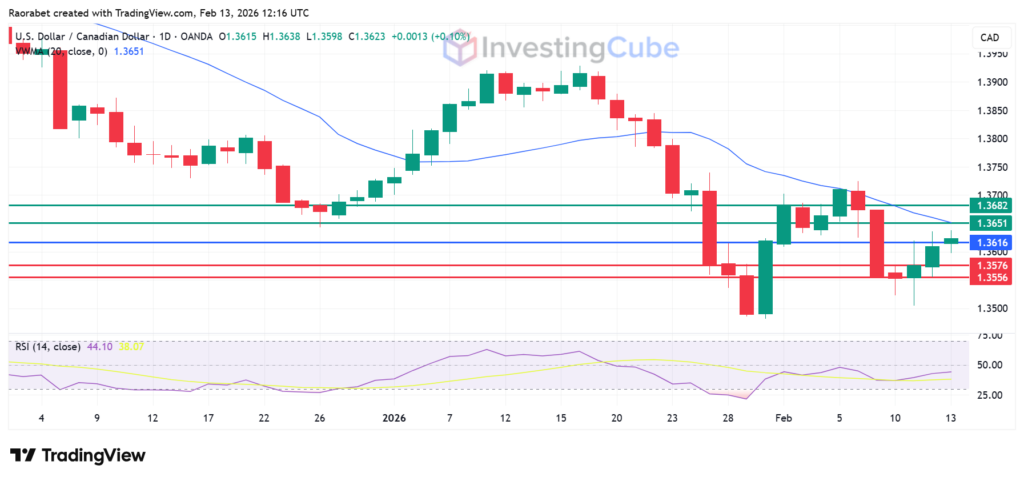 The Canadian dollar is having a difficult time this February. The USD/CAD pair is heading for its third straight day of gains, its first in 2026. On February 13, 2026, it’s trading around 1.3613, up from a low near 1.3500 last week. That’s a rise of about 0.8% since Monday.