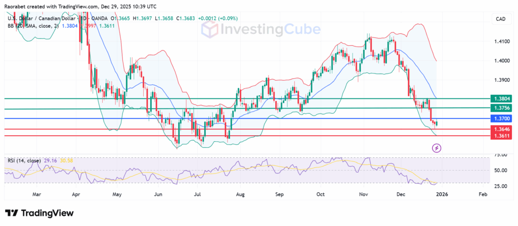 USD/CAD daily chart on December 29, 2025 with key support and resistance levels created on TradingView