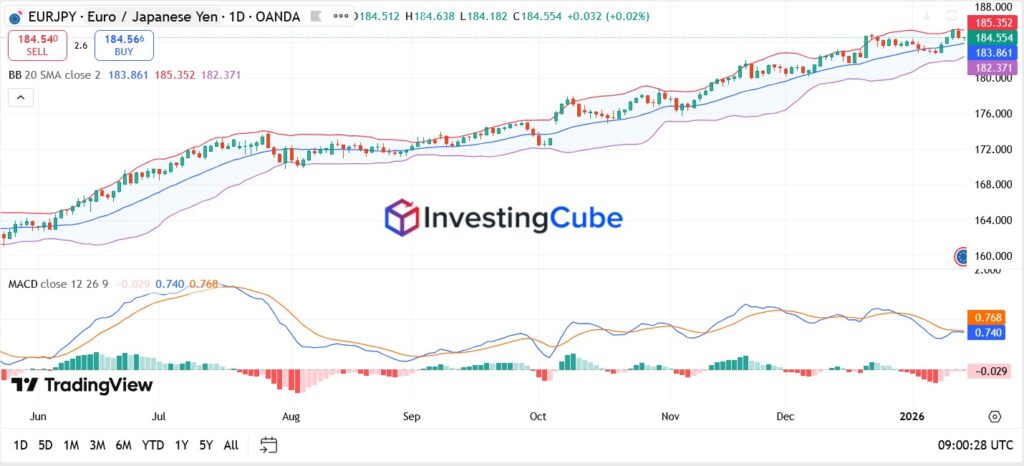 EUR/JPY continues to trade near elevated levels during European session trading, holding firm around the 184.40–184.70 region as renewed weakness in the Japanese yen offsets modest consolidation in the euro. The pair remains underpinned by a deteriorating yen backdrop, with political uncertainty and fragile bond market demand weighing on sentiment.