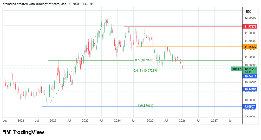 The EUR/SEK is hovering around 10.73 at the time of writing. This positioning is relevant, as the EUR/SEK forecasts from many banks and sell-side institutions point to a decline and an end-of-2026 lower level.