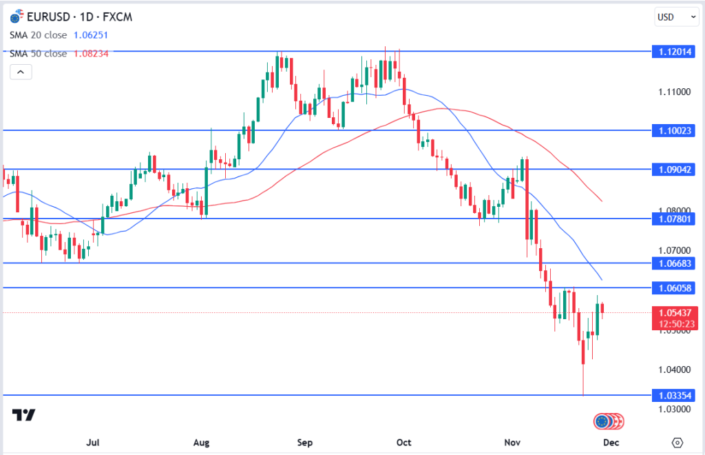 - 1.0605: The immediate resistance level, which aligns with the 20-day SMA.
