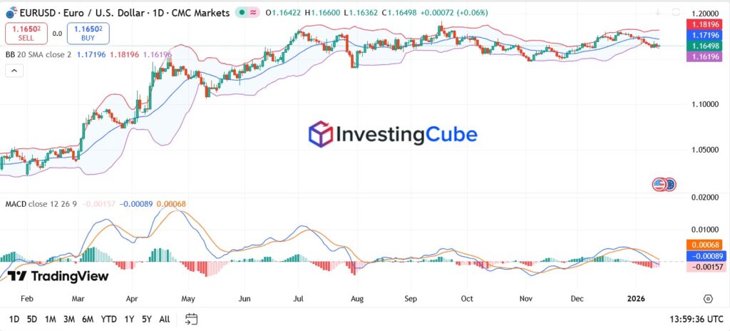 From a technical perspective, the daily chart shows EUR/USD holding above the lower Bollinger Band, suggesting downside pressure is being absorbed rather than accelerating.