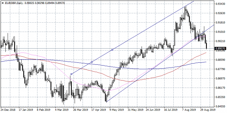 EURGBP gives up 0.45% at 0.8963, making fresh monthly lows as the pair trades below the ascending channel that drove the pair to yearly highs. UK Parliament voted a bill to force Prime Minister Boris Johnson to request an extension if he is unable to agree to a Brexit deal with the EU. UK is scheduled to leave EU on October 31. On the data front, Germany Factory Orders n.s.a. (year over year) came in at -5.6% below expectations of -1.1% in July as the downward spiral of German industry continues.