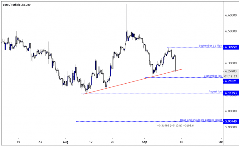 The price has also carved out a head and shoulders patterns over the last few days, and a break to the September low at 6.21 might set the trading pattern in motion, and it suggests that EURTRY might trade as low as 5.93.