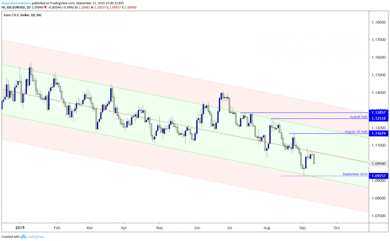 At the time of writing, the Euro (EURUSD) was down by 51 pips vs. the US Dollar, as traders appear to position themselves for a dovish outcome at tomorrow’s ECB rate meeting. The price turned lower after reaching the median line that has dominated EURUSD price action since October 2018.