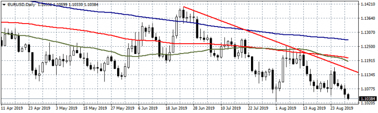 - EURUSD trading lower for fifth day in a row breaking below the previous week low and now approaching the yearly low at 1.1026. Bears are in control as the