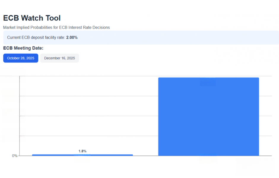 September inflation ticked up to 2.2% from 2.0% in August, enough to keep policymakers cautious. Market pricing reflects that caution: the odds of a rate hold at the October 28 meeting are above 98%. In relative terms, the ECB’s stability contrasts with the Fed’s dovish lean, which could gradually tilt flows back toward the euro.