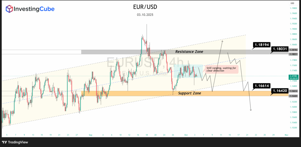 - Euro steady near 1.1720 as U.S. shutdown clouds data outlook; ECB cautious but neutral, keeping EUR/USD in consolidation.