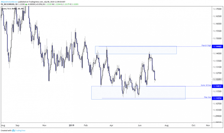 Over the last few months, the April and May low at 1.1105 have acted as support, while the March high at 1.1446 managed to block the price to trading higher in late June. I don’t think the price will be able to leave this range anytime soon, and while it is not my preferred trading style, I suspect traders will try to buy near the lower end of this range with stops below the lower limit of the range, and short-sell near the highs with stops just above 1.1446.