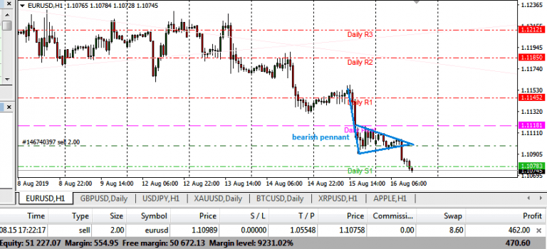 The price action for the week culminated on Thursday with the formation of a near-term bearish pennant. Price action broke through the bearish pennant and triggered a short order I initiated yesterday on the EURUSD. I expect the initial target to be the S1 support pivot at 1.1075, and further targets at the 1.1055 price level (S2 pivot) if downside momentum is maintained.