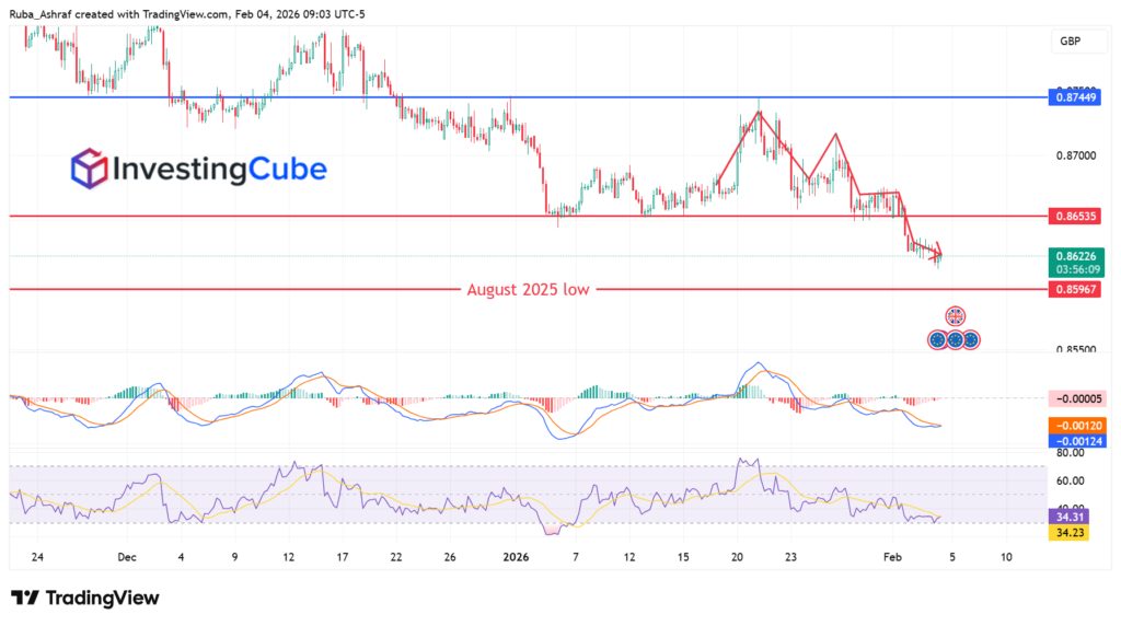 EUR/GBP is falling due to GBP strength supported by progress in UK–EU trade talks and stronger UK services data, while Eurozone growth and inflation show weakness. Technically, the pair has broken key support at 0.8653, with the MACD confirming bearish momentum and RSI in oversold territory.