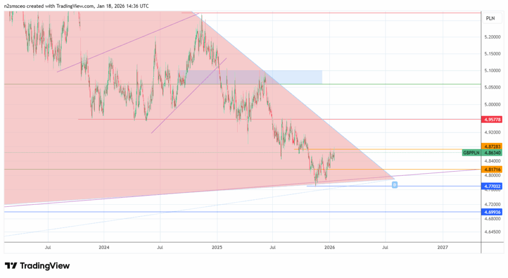 The GBP/PLN exchange rate today is the 4.8672 closing price of mid-January 2026. This keeps the currency within the weekly range, bordered by the 4.84 and 4.87 price levels. Starting points for this currency pair’s pricing helps readers understand the extent to which the GBP/PLN forecasts will play out. The end-2026 target will be a function of rate-cut differentials between the BoE and NBP.